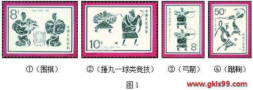 (2019·海南高考·6)图1为一组纪念邮票,邮票描绘的古代体育活动中,曾被认为是文人雅士必备素养的是( )