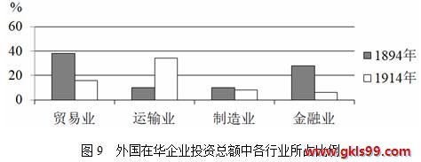 (2020·新课标全国Ⅱ卷高考·28)1894—1914年,外国在华企业投资总额有所增加,各行业所占比例如图9所示。