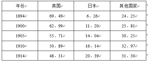 依据表格中“1894~1914年”日本对中国贸易的数字明显呈上升趋势,说明日本对中国经济侵略的加剧,故A项正确;对英贸易比重降低表明日本和其他国家加强了对中国的经济侵略,不能说明英国国际地位下降,此时的英国仍然是资本主义国家的头号强国,故B项错误;甲午中日战争之后帝国主义列强的经济侵略以资本输出为主,故C项错误;晚清中国国际地位比较低下,对其他国家贸易比重变化折射出其他资本主义国家对中国经济侵略的变化,故D项错误。
