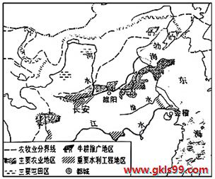 根据材料农业经济分布示意图中的信息可知,黄河中下游地区为主要农业地区,西南巴蜀地区的农业得到开发;牛耕主要在北方地区推广;重要水利工程集中在关中地区。结合所学可知,材料反映的应是西汉时期。当时经济中心在北方,江南地区尚未真正开发,故选B项;战国时期处于诸侯国割据称雄时期,主要诸侯国为争霸需要,各自发展经济,兴修水利,如秦国的都江堰等,排除A项;唐朝时期,南方经济已经获得长足发展,且安史之乱后,经济中心开始南移,排除C项;宋时,经济重心已经南移,排除D项。