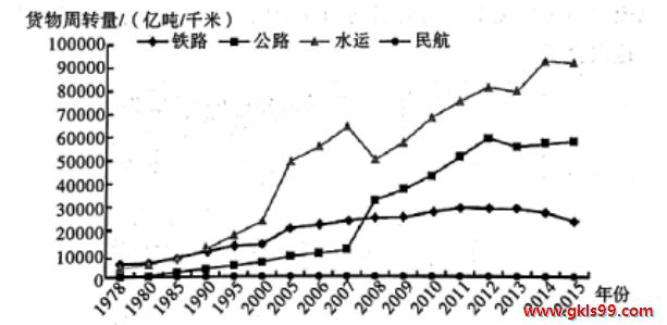 本题考查改革开放、交通运输和对数据比较分析的能力。一般情况下,人们以为水运的货物周转量并不多,但是图中的信息却体现水运的货物周转量最大,尤其是2001年加入世贸组织后增长更快,说明中国不断发展海洋运输,扩大世界市场,故答案选A。1 992年南方谈话发表,但图中的起飞点是2008年,时间不符,排除B。高铁主要负责客运,与货运不冲突,排除C。航空运输载货量低,与民航的发展无制约关系,排除D。